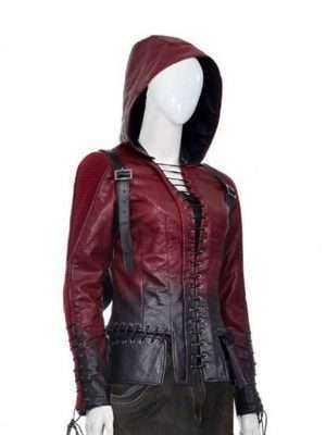 The Willa Holland Arrow Season 4 Thea Queen Leather Jacket has durable and fine stitching, with the belts on the shoulder and cowboy look this outerwear is perfect party wear. It has long sleeves along with a fitted style with a lace-up style on the cuffs. On the front it is given a full lace-up conclusion that is two-toned, it also has a hood attached at the back.