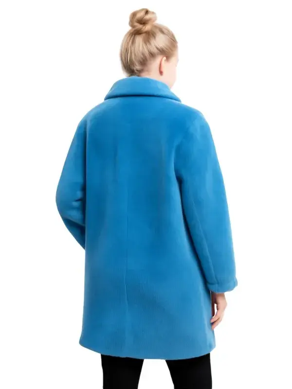 Its external shell is all installed with Vegan shearling which has a huge amount of coziness and even more, comfort is added because its inner side is through an inner viscose lining. It’s so charming looming because it has a stylish open front with a buttoned closure. Also has full-length sleeves and open hem cuffs. It’s all colored blue which makes it look super cool. The most ravishing detail in it, it has an elastic bottom end.