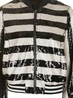 If we discuss the specifications of Kim Cattrall Filthy Rich Margaret Monreaux Sequin Bomber Jacket; Firstly, its sequin fabric exterior is worth the show! Then, the inside is finished with a soft viscose lining is essential for long-term comfort. It also has a branded front zipper closure, rib-knitted collar/cuffs, and inside-out pockets, this one is a show-stopper for carrying your divine fashion taste wherever you’ll go. And its b/w striped print is awesome!