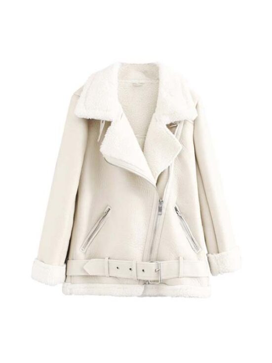 Moreover, the Itaewon Class Kim Da shearling leather jacket has full-length sleeves which concluded up on Vegan shearling lined open hem cuffs. There are two zipper pockets are given on the waist for your stuff. It comes in white color. waist belted is given for perfect fitted adjustment.