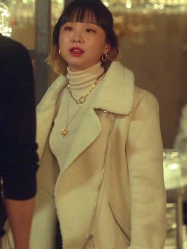o Yi Seo white leather jacket is manufactured from high-class real leather. The inside has Vegan shearling detailing which gives it a comfortable feel and maintains warmth in enough amount. The jacket has a Vegan shearling wide collar along with a buttoned closing front it giving stunning look.