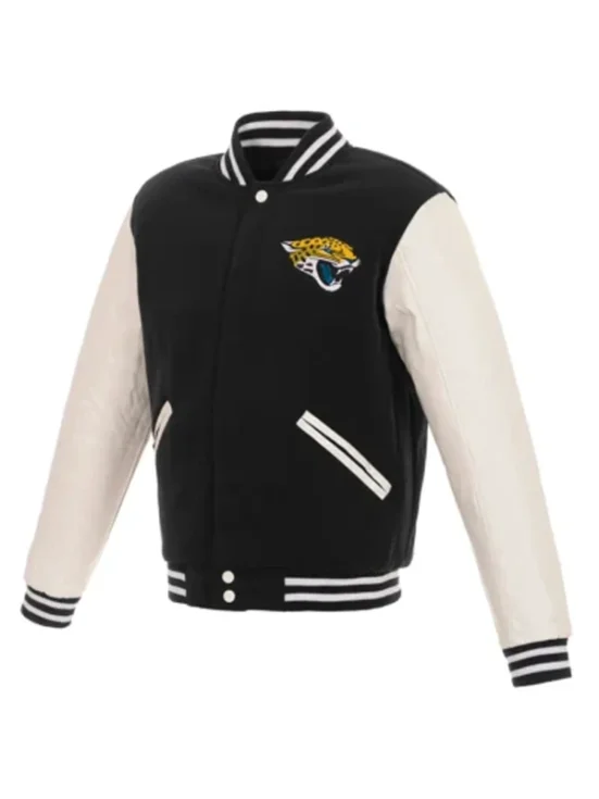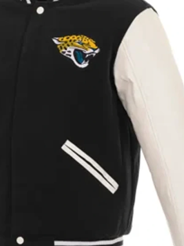 The Jacksonville Jaguars Varsity Jacket adds a classic, vibrant touch to your game-day outfit. We made this garment with a strong contrast: a deep black wool body and crisp white sleeves that reflect the high-stakes adrenaline of the gridiron. It fits well and is organized, so it’s a must-have for supporters who wish to move easily from the stadium to the city streets.