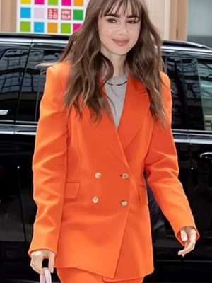 Comes in genuine suiting material this must-have Movie Windfall 2022 Promotion Lily Collins Orange Suit is tailored with a soft viscose lining to keep you warm and comfortable. To give an alluring vibe, it has a front double-breasted buttoned closure with a collar having a tremendous peak lapel style and long sleeves along with open hem cuffs. Tempting orange in color, this blazer provides an invigorating look perfect to upscale your persona with two outside pockets for holding your stuff safely.