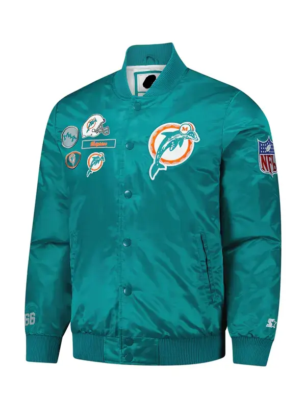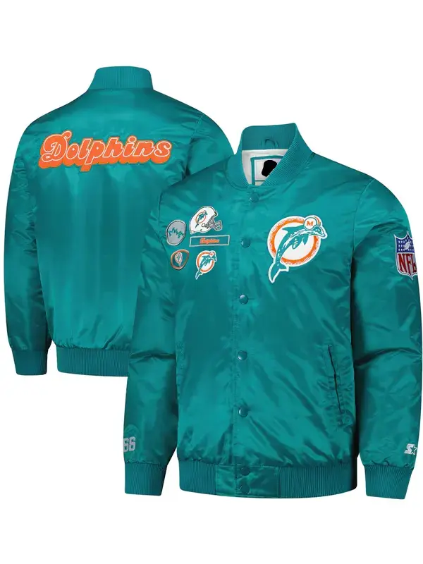 This Miami Dolphins varsity jackets are perfect for fans who love varsity-style fashion. It is clean and sleek in silhouette. The bold embroidery adds depth and texture. Showcasing the team logos and branding pop against the aqua background. Whether you’re wearing it to support the Dolphins on game day.  Or want to wear the jacket as your daily street wear. This Official Miami Dolphins NFL starter jacket delivers a perfect blend of sporty and stylish.