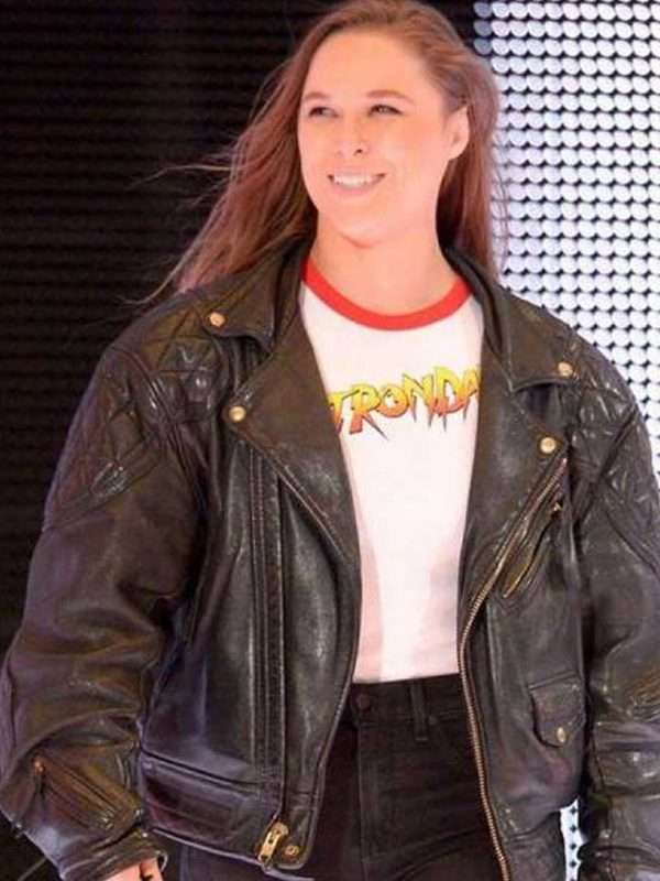 This bomber-style Ronda Rousey Black Jacket is designed using real leather material with viscose lining inside for durability and to make it sweat-free. On the front, it has branded asymmetrical zipper closure and two zipper side pockets, and one flap pocket at the front so you can keep your cash and gadgets in it securely.