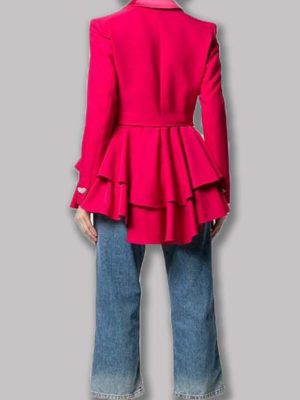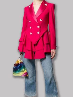 Keeley Janes Ted Lasso Pink heart buttoned blazer is the best attire that you should add in your wardrobe and impress the people with your amazing sense of dressing and appealing persona. The silver heart shaped buttoned double breasted closure with stylish frock style frill detailing make it overwhelming