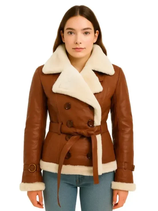 Women’s Double Breasted Brown Shearling Leather Jacket
